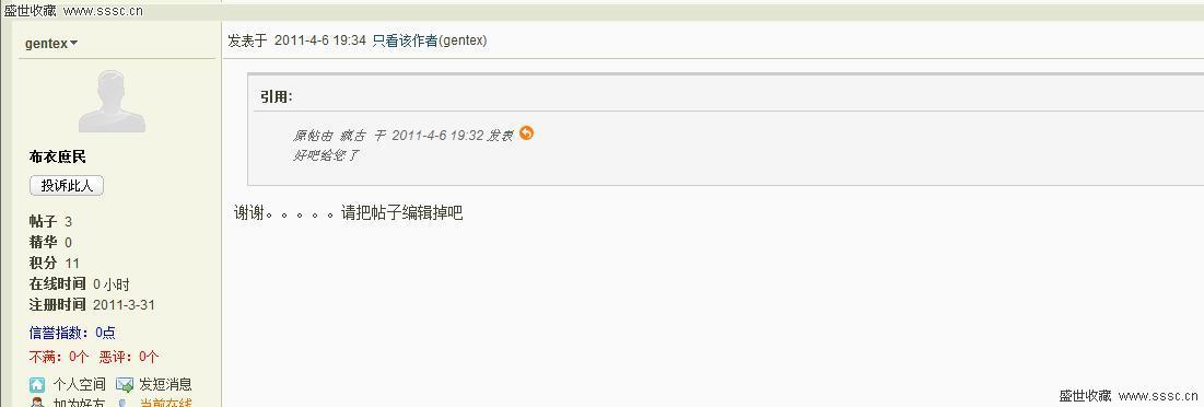 正文摘要:本人今晚看上瘋古同志的一把刺刀,并在帖子中回帖說定下,賣家也確認(rèn)了。 6 R5 o, ^ n3 I& C并打電話談好價格,雙方表示無異議。 " U) c7 o- N( a! q[attachimg]6746988[/attachimg]: S; `& ?% o& j" d+ ... |