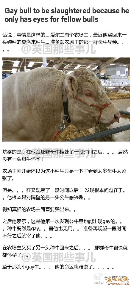 正文摘要:話說... 愛爾蘭一個農(nóng)場主最近買回來了一頭純種小種牛.. 結果發(fā)現(xiàn)那是一頭小gay牛! 一頭母牛都沒搞懷孕。。倒是成天對隔壁的公牛感興趣。。 。。。欲哭無淚的農(nóng)場主表示。。 種牛當gay要你何用啊。。。準備過一段時 ... |