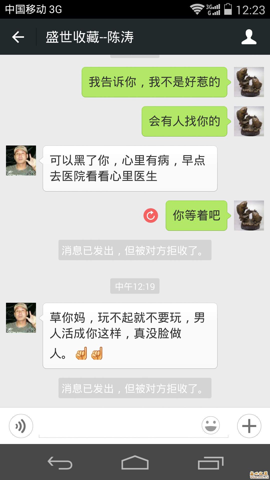 正文摘要:盛世收藏--陳濤 **號gmyMSG520168 - T( q8 i6 c( }0 K4 d" \. W' c" S 1 {; d2 J% Z" y7 j手機15158641412% |% o0 Y+ L- a, {8 q( A3 v 事由入下:我在盛世收藏通過**認識此人,有過交流,當時也很誠信。 ... |